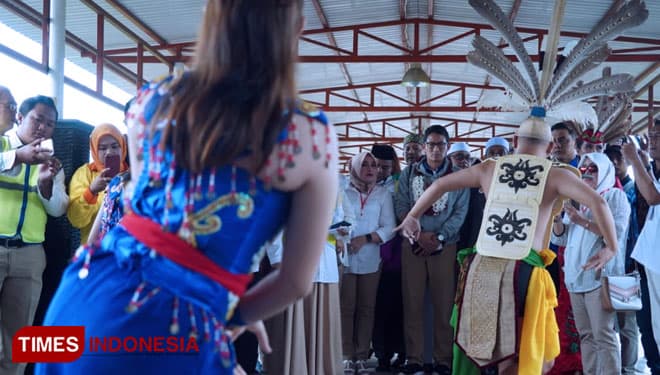 TIMES Purwakarta/Cawapres Nomor urut 02, Sandiaga Salahuddin Uno disambut dengan upacara adat Tetek Pantan saat tiba di Bandara Tjilik Riwut Palangkaraya, Kalimantan, Senin (04/02/2019). (FOTO: Tofik For TIMES Indonesia)