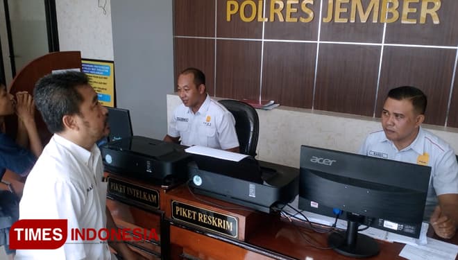 TIMES Purwakarta/Wakil Ketua Bidang Litbang dan IT DPD Partai Perindo Kebupaten Jember, Ahmad One Prastiono saat melaporkan Ketua DPD Partai Perindo Kabupaten Jember Hanung Prijobodo ke Polres Jember, Senin (6/5/2019). (FOTO: Dody Bayu/TIMES Indonesia)